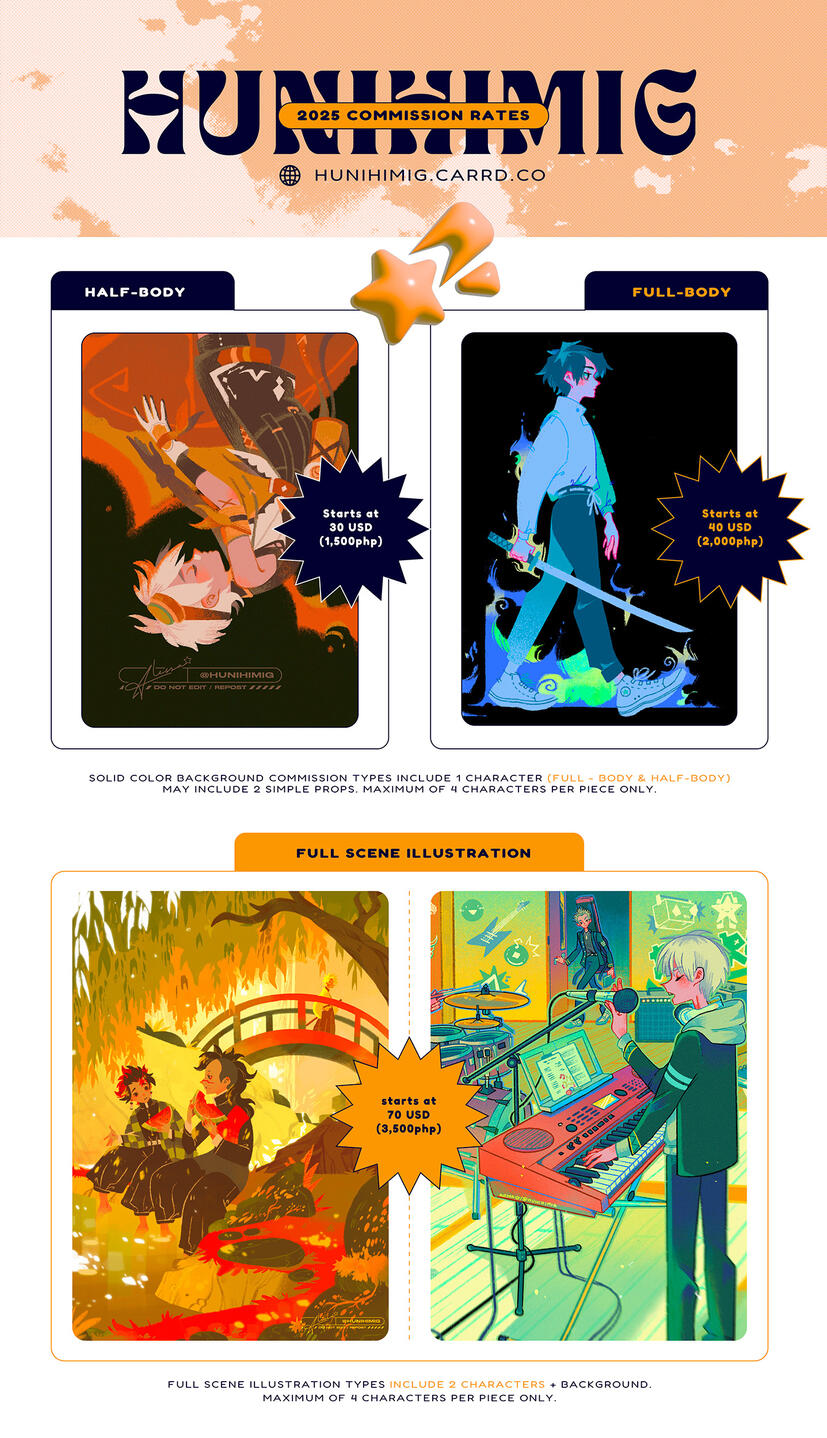 Hi! The commission types and rates indicated here are for personal / non-commercial use ONLY.However, if you'd like to inquire about commercial projects / zine / other business inquiries, you can email me here at: